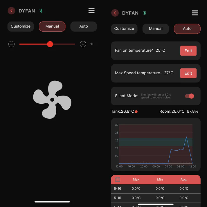 Bluetooth Edition Cooling Fan može se kontrolirati samo putem mobilne aplikacije My Chihiros, a tipke na ventilatoru (Manual Edition Cooling Fan može koristiti tipke za kontrolu) nemaju praktican ucinak. Samo USB kabel, preporucuje se korištenje izlaznog utikaca 5V3A (kupuje se zasebno). Opremljen temperaturnom sondom, može mjeriti temperaturu vode. Ugradeni senzor temperature i vlažnosti, može mjeriti sobnu temperaturu i vlažnost. Naprednije postavke putem automatskog nacina rada. Visokoucinkovit akvarijski ventilator, tihi, s ugradenim motorom bez cetkica, kucište od aluminijske legure s razinom zaštite IP55. Ventilator visoke kvalitete može ekonomicno i ucinkovito hladiti vodu u akvariju korištenjem velike kolicine zraka za isparavanje. Odgovarajuca brzina vjetra može se odabrati prema sobnoj temperaturi, temperatura vode može se smanjiti za 2 ~ 4°C, podesiva stezaljka može se pricvrstiti na debljinu stijenke cilindra do 20 mm, bez potrebe za instalacijom, jednostavno za korištenje, može se lako pricvrstiti na rub akvarija, vrlo cvrsto. Siguran i pouzdan: nazivni napon ventilatora je 5V, visok sigurnosni standard, osigurava sigurnost ventilatora. Namotaj udaljen od vode u akvariju ne predstavlja rizik od kratkog spoja. Tihi, energetski ucinkovit: to je hladan ventilator za slatkovodne i morske akvarije, pa je mnogo tiši od obicnog ventilatora. 5 volti sigurnog napona za ljude, niska potrošnja energije, ne samo da štedi energiju, vec i pruža vašim ribama ugodno ljeto. Pogodan za akvarije unutar 60 cm, može stegnuti debljinu stakla od 5 do 20 mm. Nazivni napon: DC 5V Nazivna struja: 0.27 ±10%A Nazivna ulazna snaga: 2.8 ±0.5W Revolucija motora: 3800RPM ±10% Radna temperatura: -10°C ~ +85°C |