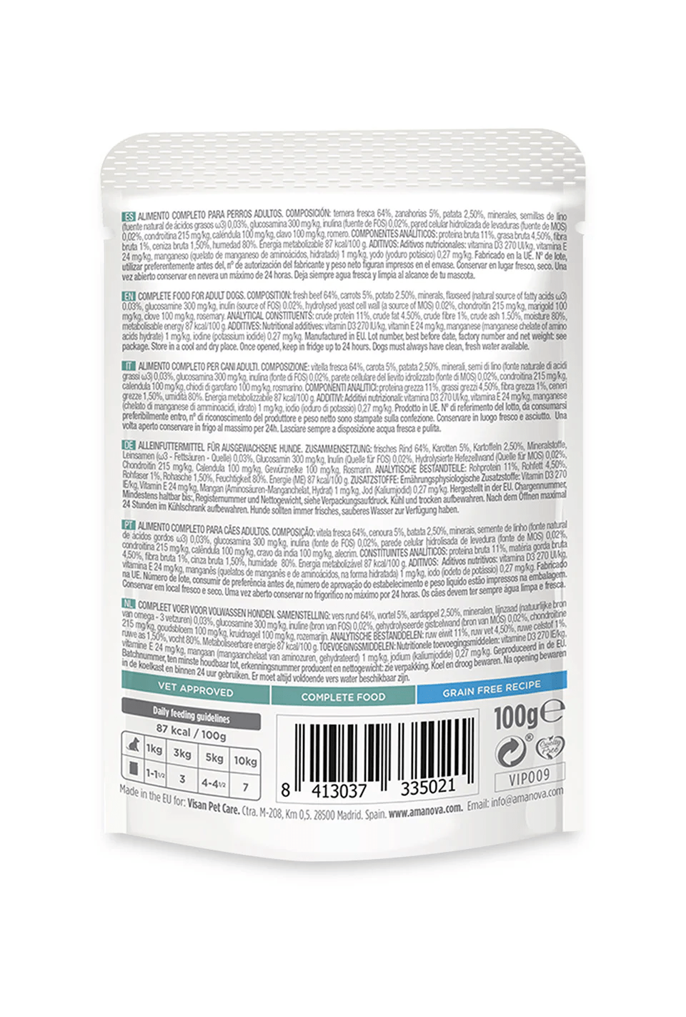 | Opis: | Amanova Adult Irresistible Beef 300g P02 POTPUNA HRANA ZA ODRASLE PSE. SASTOJCI: svježa govedina 64%, mrkva 5%, krumpir 2,50%, minerali, sjeme lana (prirodni izvor masnih kiselina omega-3) 0,03%, glukozamin 300 mg/kg, inulin (izvor FOS) 0,02%, hidrolizirana stanicna stijenka kvasca (izvor MOS) 0,02%, hondroitin 215 mg/kg, neven 100 mg/kg, klincic 100 mg/kg, ružmarin. ANALITICKI SASTAV: sirove bjelancevine 11%, sirove masti 4,50%, sirova vlaknina 1%, sirovi pepeo 1,50%, vlaga 80%, metabolizirajuca energija 87 kcal/100 g. DODACI:Nutritivni dodaci: vitamin D3 270 IU/kg, vitamin E 24 mg/kg, mangan (manganov kelat iz hidrata aminokiselina) 1 mg/kg, jod (kalijev jodid) 0,27 mg/kg. Cuvati na hladnom i suhom mjestu. Nakon otvaranja cuvati u hladnjaku do 24 sata. Psi uvijek moraju imati cistu, svježu vodu. UPUTA ZA HRANJENJE: navedeno na ambalaži. Proizvedeno u EU. Lot broj, rok trajanja, serijski broj i neto težina: navedeno na ambalaži. |