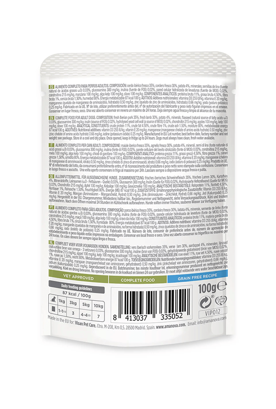 | Opis: | Amanova Adult Luscious Lamb & Pork 300g P05 POTPUNA HRANA ZA ODRASLE PSE. SASTOJCI: svježa iberijska svinjetina 35%,svježa janjetina 30%,krumpir 4% minerali, sjeme lana (prirodni izvor masnih kiselina omega-3) 0,03%, glukozamin 300 mg/kg, inulin (izvor FOS) 0,02%, hidrolizirana stanicna stijenka kvasca (izvor MOS) 0,02%, hondroitin 215 mg/kg, jabuke 100 mg/kg, kelp 100 mg/kg, klincic 100 mg/kg. ANALITICKI SASTAV: sirove bjelancevine 11%, sirove masti 4,50%, sirova vlaknina 1%, sirovi pepeo 1,50%, vlaga 80%, metabolizirajuca energija 87 kcal/100 g. DODACI: Nutritivni dodaci: vitamin D3 255 IU/kg, vitamin E 20 mg/kg,mangan (manganov kelat iz hidrata aminokiselina) 0,50 mg/kg, cink (cinkov kelat iz hidrata aminokiselina) 0,66 mg/kg, jod (kalijev jodid) 0,25 mg/kg. Cuvati na hladnom i suhom mjestu. Nakon otvaranja cuvati u hladnjaku do 24 sata. Psi uvijek moraju imati na raspolaganju cistu, svježu vodu. UPUTA ZA HRANJENJE: navedeno na ambalaži. Proizvedeno u EU. Lot broj, rok trajanja, serijski broj i neto težina: navedeno na ambalaži. |