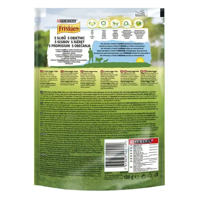 | Opis: | Friskies Beggin' Strips je ukusna poslastica za žvakanje s okusom slanine koju ce vaš pas obožavati. Napravljeno bez umjetnih bojila, aroma i konzervansa. Friskies Beggin' Strips idealan je u svako doba, kao poslastica ili nagrada. Friskies 5 obecanja za Vašeg sretnog i zdravog psa: - Okus: ukusne recepture donose srecu u Vaš dom. - Kvaliteta: provodimo na stotine dnevnih provjera kroz proces proizvodnje. - Strucnost: razvijeno od strane Purina strucnjaka. - Sljedivost: napravljeno s kvalitetnim sastojcima, pažljivo odabranim od provjerenih dobavljaca. Ukusan okus slanine. Vitamini. Omega 3 i 6 masne kiseline. Nizak udio masti. Sastojci Žitarice Meso i proizvodi životinjskog podrijetla Glicerol Ekstrakti biljnih proteina Šeceri Ulja i masti Mineralne tvari Mlijeko i mlijecni proizvodi Analiticki sastojci Bjelancevine: 15.7% Sadržaj masti: 5.7% Sirovi pepeo: 4.1% Sirova vlaknina/sirova vlakna: 1.0% Vlaga: 23.0% Omega 3 masne kiseline: 0.09% Omega 6 masne kiseline: 1.6% Dodaci prehrani IJ/kg: Vit. A: 10 000; Vit. D3: 680; Vit. E: 74. mg/kg: Vitamini B skupine: 65; Bezvodni kalcijev jodat: 1,6; Mangan sulfat monohidrat: 4,8; Cinkov sulfat monohidrat: 120; Natrijev selenit: 0,16. Svježa i cista voda uvijek mora biti dostupna. Za zdravlje vašeg psa, slijedite upute za hranjenje i svakodnevno ga vježbajte. Pas mora biti pod nadzorom prilikom primanja nagrade. |
