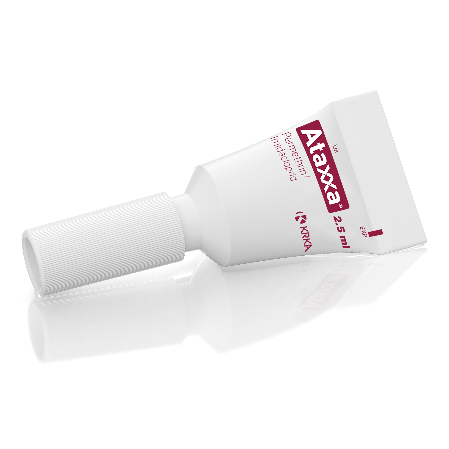| Opis: | Naziv VMP: Ataxxa, otopina za nakapavanje 200 mg/40 mg za pse do 4 kg, 500 mg/100 mg za pse od 4 kg do 10 kg, 1250 mg/250 mg za pse od 10 do 25 kg i 2000 mg/400 mg za pse od 25 kg. Na koga djeluje Ataxxa? Ataxxa djeluje repelentno (odbija) krpelje, komarce i papatače te za liječenje i sprječavanje infestacije buhama. Koje su ciljne vrste životinja za primjenu Ataxxe? Za pse starije od 7 tjedana i teže od 1,5 kg. NE PRIMJENJIVATI MAČKAMA! Kako Ataxxa djeluje? Nakon primjene, otopina za nakapavanje širi se po cijelom tijelu životinje. Buhe na psima ugibaju unutar jednog dana nakon primjene. Obje djelatne tvari ostaju na koži i dlaci najmanje četiri tjedna. Ataxxa je učinkovita u kontaktu s parazitom, što znači da ubija parazite nakon kontakta s djelatnom tvari na koži ili dlaci. Paraziti dolaze u kontakt s djelatnom tvari prije nego mogu ugristi životinju. Djelatna tvar permetrin1 odbija krpelje jer im ograničava kretanje i nadražuje im nožne članke (uzrokuje tzv. „hot foot“ efekt). Ataxxa se može koristiti kao dio strategije liječenja alergijskog dermatitisa uzrokovanog buhama (engl. flea allergy dermatitis -FAD). Kako se Ataxxa primjenjuje? Pipetu treba izvaditi iz vrećice i držati uspravno. Uski dio pipete treba lagano udariti kako bi se osiguralo da je sadržaj u proširenom dijelu pipete, a zatim treba odvrnuti i skinuti čep. Čep treba okrenuti i njegov drugi kraj postaviti na pipetu. Čep treba pritisnuti i zakrenuti kako bi se probola brtva. Nakon toga čep treba skinuti s pipete. Za pse tjelesne mase do 10 kg Dok pas mirno stoji treba razmaknuti dlaku u međulopatičnom području tako da koža postane vidljiva. Vrh pipete treba staviti na kožu te pipetu čvrsto stisnuti nekoliko puta kako bi se sadržaj u cijelosti ispraznio izravno na kožu. Za pse tjelesne mase veće od 10 kg Dok pas mirno stoji cijeli sadržaj pipete treba ravnomjerno primijeniti na četiri mjesta na koži leđa, od međulopatičnog područja do korijena repa. Na svakom mjestu treba razmaknuti dlaku tako da koža postane vidljiva. Vrh pipete treba staviti na kožu te lagano istisnuti samo dio otopine na kožu. Na jedno mjesto se ne smije primijeniti prekomjerna količina otopine jer u tom slučaju dio istisnute otopine može postrano skliznuti s psa. Ataxxa je dostupna u četiri jačine. Doziranje nakapavanjem na kožu u skladu s tjelesnom masom je sljedeće: Tjelesna masa psa do 4 kg Ataxxa 0,4 ml 4–10 kg Ataxxa 1 ml 10–25 kg Ataxxa 2,5 ml 25–40 kg Ataxxa 4 ml >40 kg 2 pipete različitih jačina Sastav: Djelatnetvari: Permetrin i Imidakloprid. Indikacije: Veterinarsko-medicinski proizvod (VMP) se primjenjuje za lijecenje i sprjecavanje infestacije buhama (Ctenocephalides felis). Buhe na psima ugibaju unutar jednog dana nakon primjene. Jedna primjena sprjecava nove infestacije buhama tijekom cetiri tjedna. VMP se može koristiti kao dio strategije lijecenja alergijskog dermatitisa uzrokovanog buhama (engl. flea allergy dermatitis - FAD). VMP omogucuje neprekidnu akaricidnu ucinkovitost protiv infestacija krpeljima (Rhipicephalus sanguineus i Ixodes ricinus tijekom cetiri tjedna, a Dermacentor reticulatus tijekom tri tjedna) ) i neprekidnu repelentnu ucinkovitost (Ixodes ricinus) u trajanju 3 tjedna. Postoji mogucnost da krpelji na psu ne uginu unutar dva dana nakon primjene VMP-a te mogu ostati pricvršceni i vidljivi. Uvrijeme primjene VMP-a preporucuje se uklanjanje nepricvršcenih krpelja na psu, kako bi ih se sprijecilo u pricvršcivanju i hranjenju. Jedna primjena osigurava repelentni ucinak (sprjecava hranjenje) protiv infestacije papatacima Phlebotomus perniciosus tijekom 3 tjedna te protiv infestacije komarcima Aedes aegypti od 7 dana do 14 dana nakon primjene.. Doziranje i nacin primjene: Najmanja preporucena doza je: 10 mg imidakloprida/kg tjelesne mase (t.m.) i 50 mg permetrina/kg t.m. Doziranje nakapavanjem na kožu treba biti u skladu s tjelesnom masom (vidjeti Uputu). Nuspojave: Vrlo rijetko, na mjestu primjene VMP-a mogu se pojaviti svrbež, gubitak dlake, crvenilo, oteklina i erozije. Ove nuspojave obicno spontano nestaju. Posebna upozorenja: Prilikom primjene VMP-a treba paziti da sadržaj pipete ne dode u kontakt s ocima ili ustima tretiranih pasa. Treba paziti da se VMP primijeni ispravno. Kontraindikacije: Zbog nedostatka odgovarajucih podataka, VMP se ne smije primjenjivati štenadi mladoj od 7 tjedana ili lakšoj od 1,5 kg. Interakcije: Nisu poznate. Ciljne vrste životinja: Pas. Karencija: Nije primjenjivo. Nositelj odobrenja za stavljanje u promet: KRKA, d.d., Novo mesto, Šmarješka cesta 6, 8501 Novo mesto, Slovenija. Nacin izdavanja: VMP se ne izdaje na veterinarski recept. |