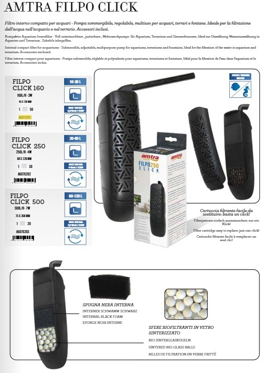 | Opis: | Unutarnji filter Amtra Filpo Click impresionira svojom izvedbom i iznimno jednostavnim održavanjem. Izuzetno jednostavno čišćenje i zamjena prednje maske zahvaljujući click-on sistemu, dok je filter u akvariju! Uključuje filtarski materijal (spužva, ugljen, biološki materijal-keramika). Brzina protoka jednostavno podesiva. -- Filter dolazi sa prednjom filter maskom koja sadrži aktivni ugljen. Posebno se može kupiti filter maska samo sa spužvom, ukoliko Vam ne odgovara filtriranje preko aktivnog ugljena u akvariju ( u slučaju liječenja, ukoliko želite imati obojanost vode od panjeva i slično). FILPO CLICK 250 Maksimalni protok vode 250 lt / h - 5,0 W |